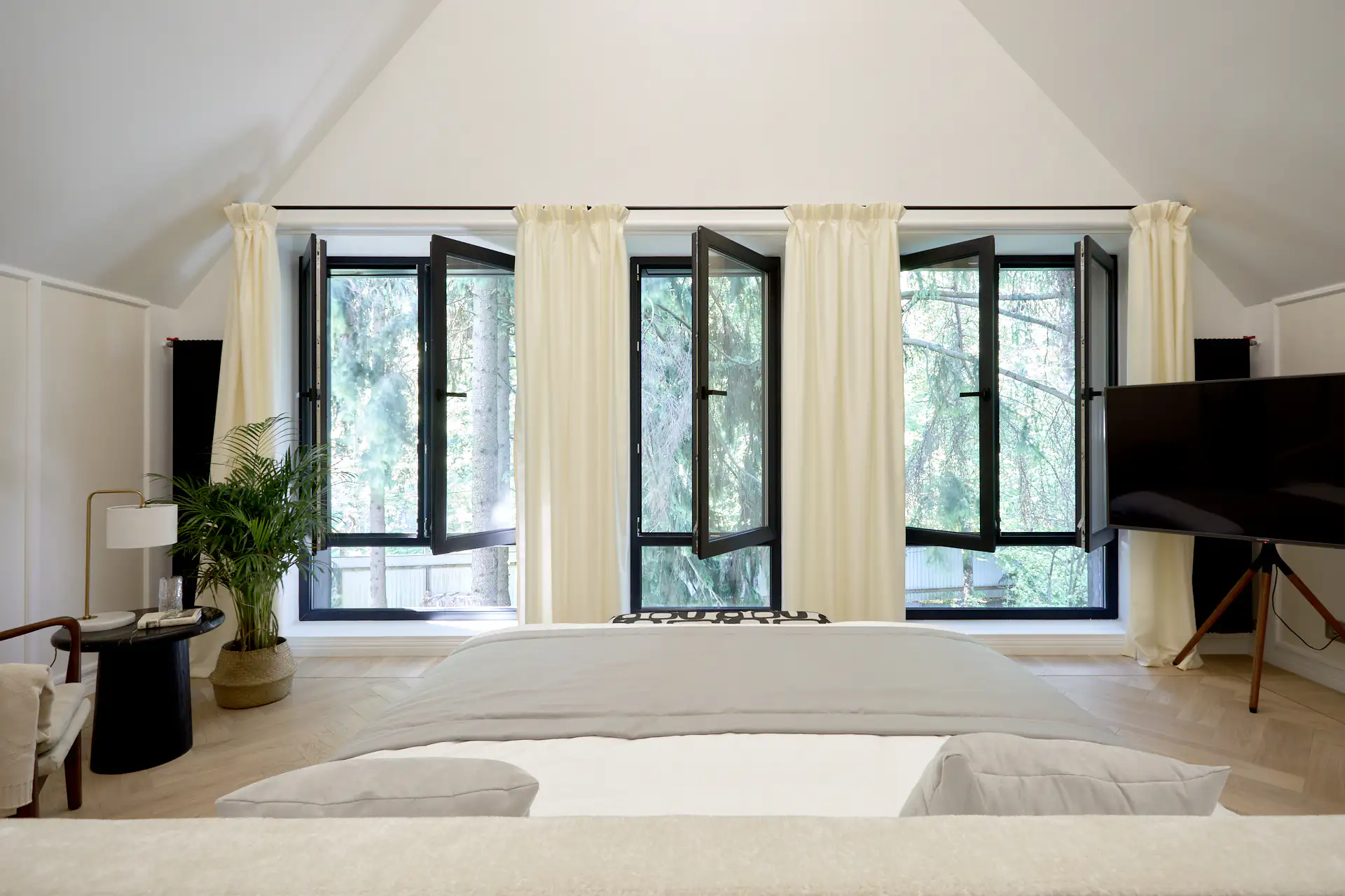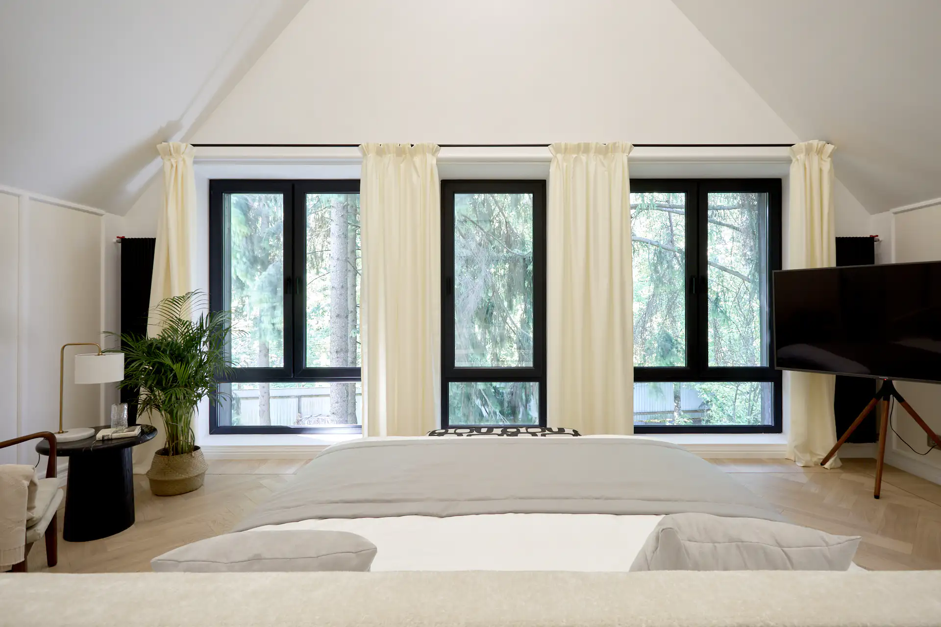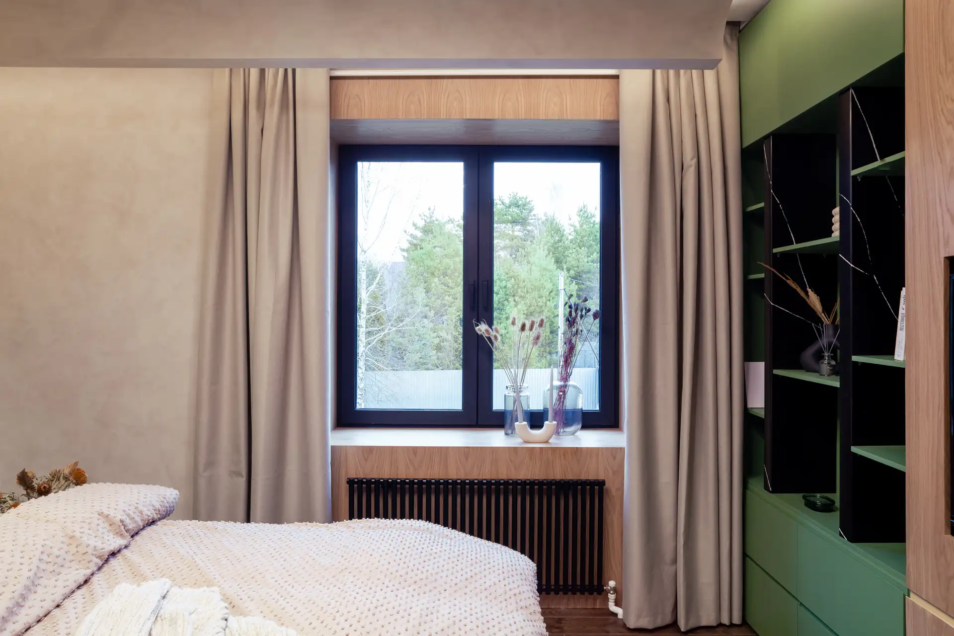 Чёрные рамы подходят не только для ультрасовременных проектов — в спокойных интерьерах они добавляют глубины, аккуратно выделяют форму окна, не перегружая пространство.