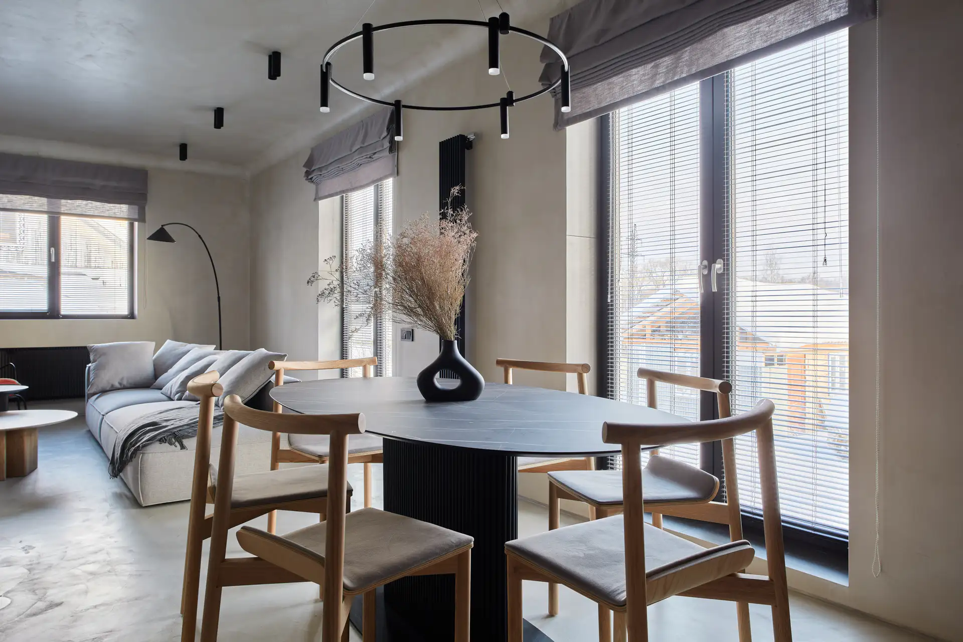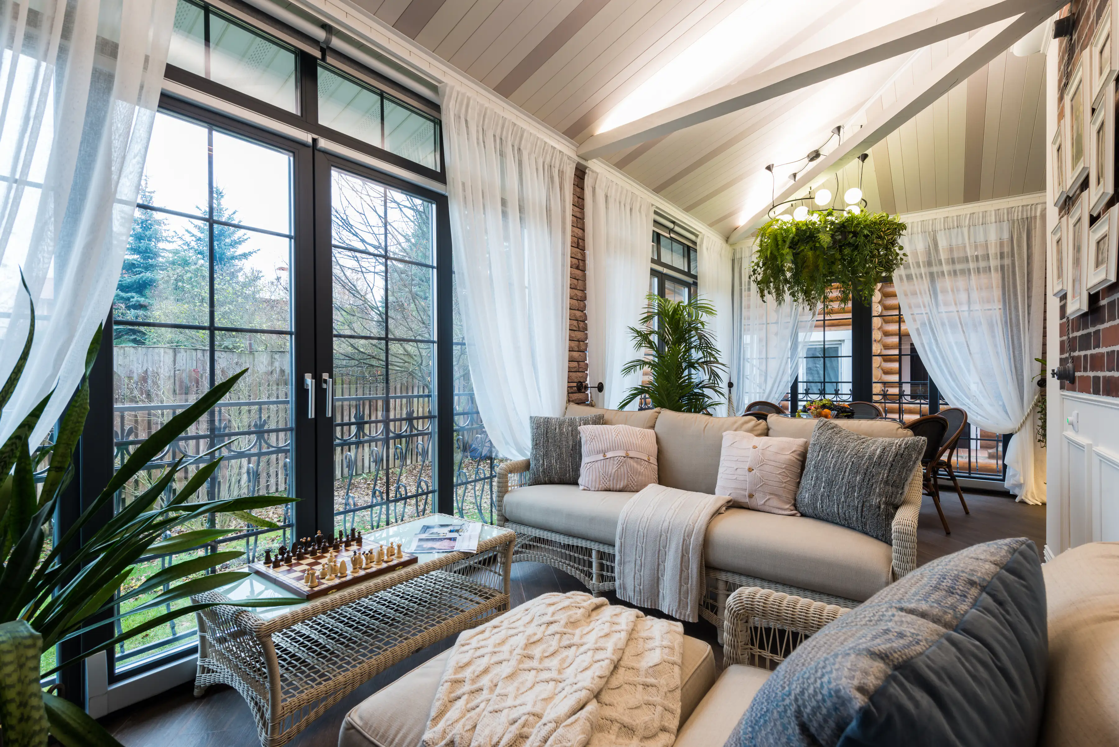 • Уместны в панорамном остеклении — тонкая рама выглядит сдержанно, не отвлекает внимание.
